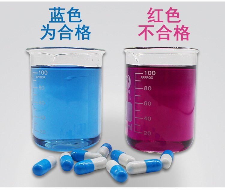 測試方法:取100毫升鍋爐給水(軟化水)倒入250毫升的錐形瓶中,將一??傆捕葴y試膠囊對準(zhǔn)瓶口慢慢旋轉(zhuǎn)拉開全部倒入,搖動(dòng)到完全溶解,用標(biāo)準(zhǔn)色版比對即得總硬度值。藍(lán)色為合格,紅色為不合格。